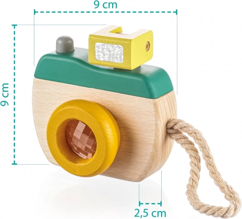 Fabricat din lemn de calitate, acest aparat foto este ușor și compact, ideal pentru micii fotografi. Este echipat cu o curea rezistentă pentru transport facil.