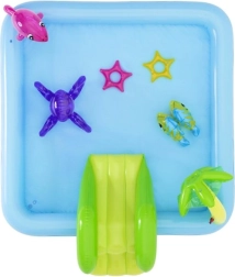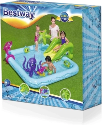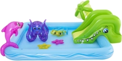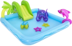 Înveseliți grădina cu terenul de joacă acvatic gonflabil pentru copii BESTWAY, cu motiv de acvariu marin. Oferă tobogan detașabil, fântână de apă după conectarea furtunului și o mulțime de jucării gonflabile (delfin, caracatiță, peștișori și steluțe) pentru ore întregi de distracție în zilele toride. Materialul PVC rezistent, valvele de siguranță și golirea ușoară a apei asigură utilizare comodă și sigură.