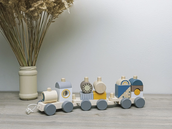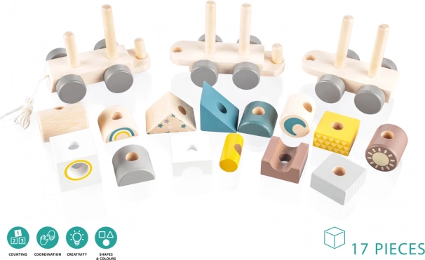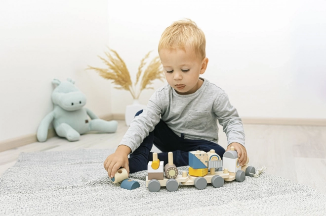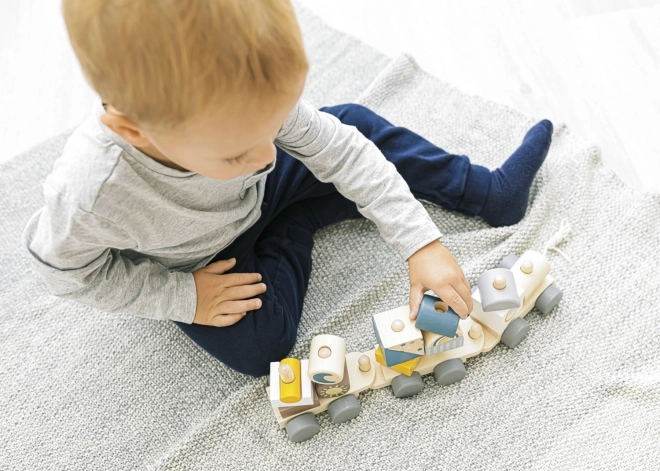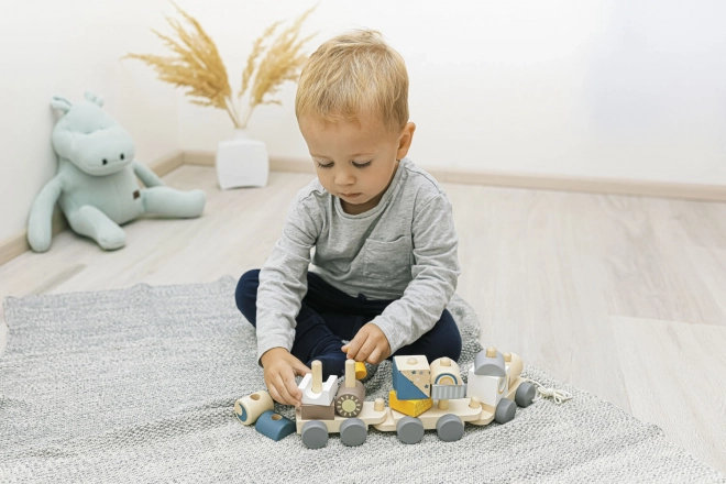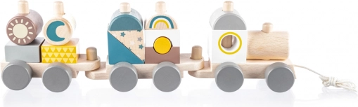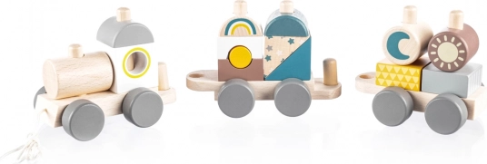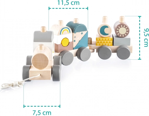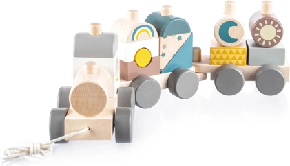 Trenuleț de lemn colorat pentru copii, care le susține abilitățile motorii. Acest trenuleț interactiv și educativ le permite copiilor să îl asambleze și să îl tragă, motivându-i să meargă și dezvoltându-le creativitatea.