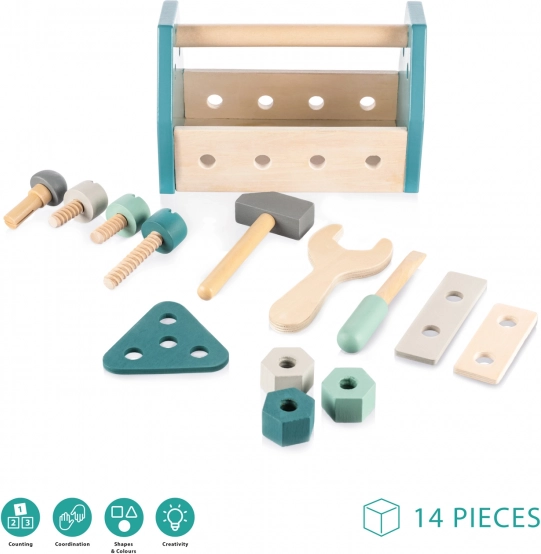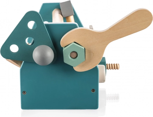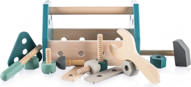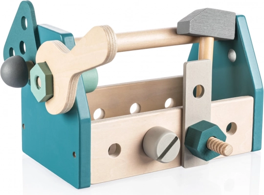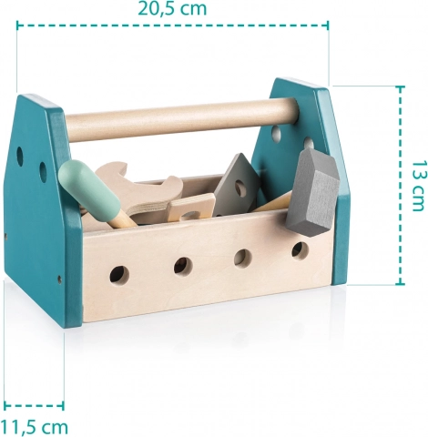 Cu acest set de scule, copiii pot crea și gestiona fără limite, își pot dezvolta creativitatea, motricitatea, coordonarea, capacitatea de sortare și rezolvarea problemelor. Întregul set este realizat din lemn de fag natural și vopsele sigure pe bază de apă.