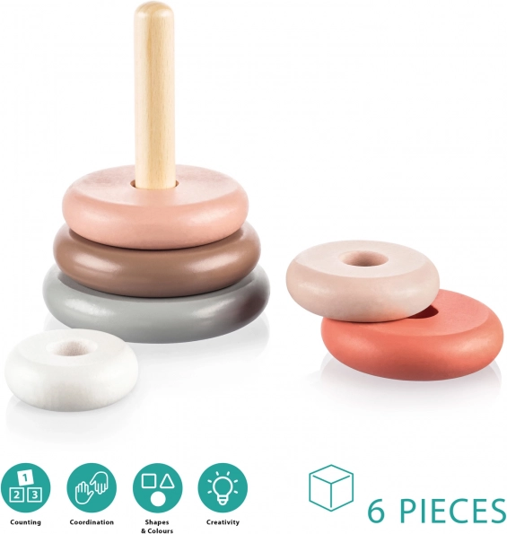 Stivuire, demontare, sortare și zeci de combinații diferite – acestea sunt inelele din lemn de stivuire pentru micii exploratori curioși. Setul este format din 6 piese de dimensiuni diferite, care pot fi stivuite una peste alta în orice ordine.