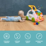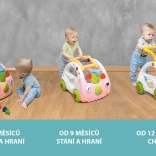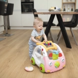 Pe laterale găsiți cuburi de activități, precum și un puzzle și un abac, care dezvoltă motricitatea fină și gândirea logică. Cheia interactivă cu butoane activează efecte luminoase și sonore ce stimulează explorarea. Designul drăgălaș de mașinuță va cuceri rapid copiii.