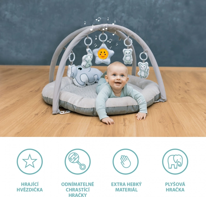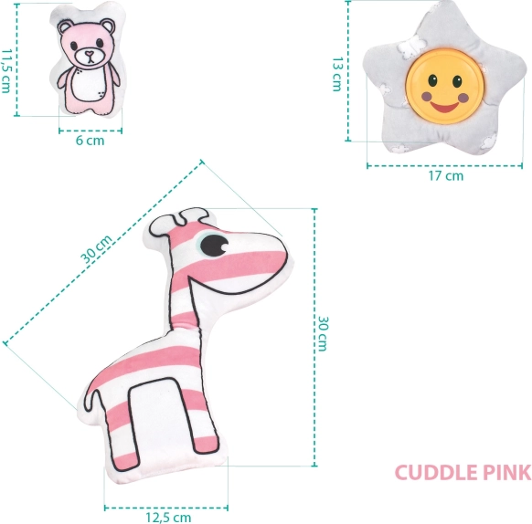 În setul covorașului de joacă este inclusă și o jucărie din pluș cu design modern.