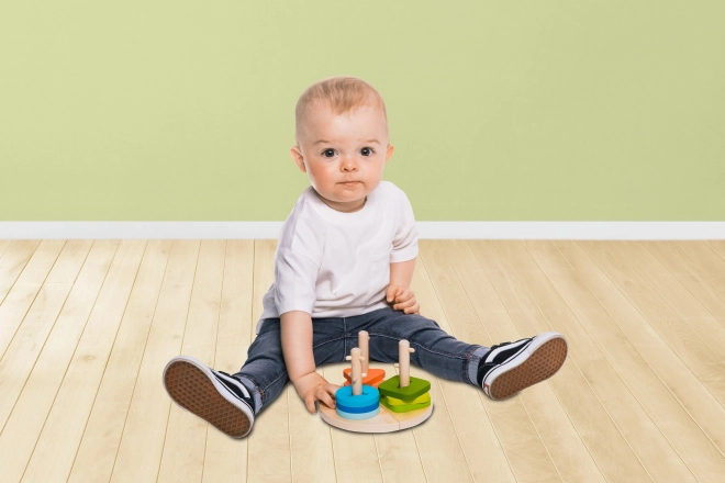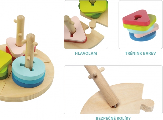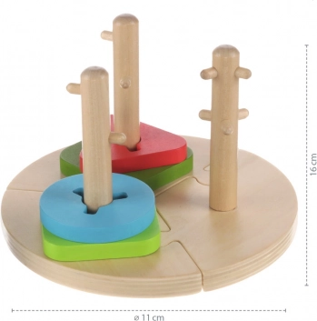 Puzzle colorat pe suport rotund din 3 piese. Fiecare piesă conține o tijă din lemn cu proeminențe, pe care pot fi așezate forme colorate din lemn. Jucăria dezvoltă coordonarea, imaginația spațială și îndemânarea mâinilor. Datorită numeroaselor posibilități de asamblare, stimulează de asemenea mintea copilului și susține gândirea creativă. Puzzle-ul este realizat din lemn de calitate și vopsele pe bază de apă.