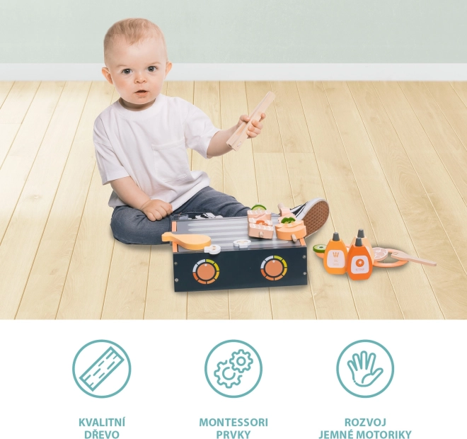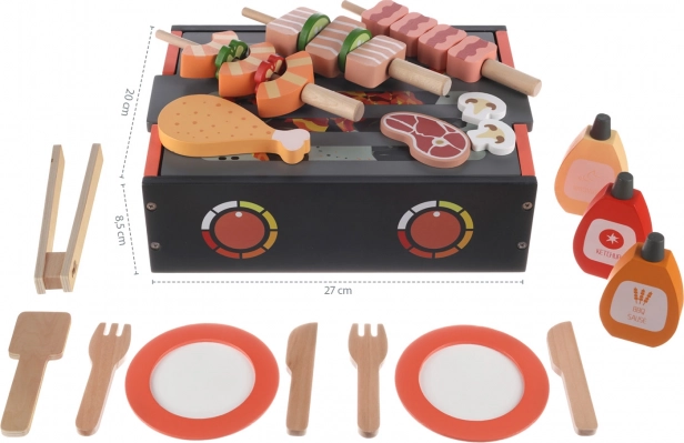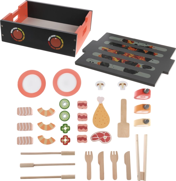 Grătarul din lemn servește în același timp ca o cutie de depozitare pentru toate ingredientele pe care copilul dorește să le gătească la grătar. Este suficient să glisați placa superioară de gătit, iar dedesubt se află carne din lemn, legume, sosuri, garnituri, dar și farfurie, tacâmuri și unelte pentru grătar. Jucăria este realizată din lemn de fag rezistent, iar toate vopselele folosite sunt sigure pentru sănătate și pe bază de apă.