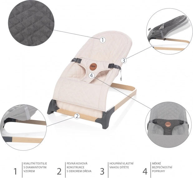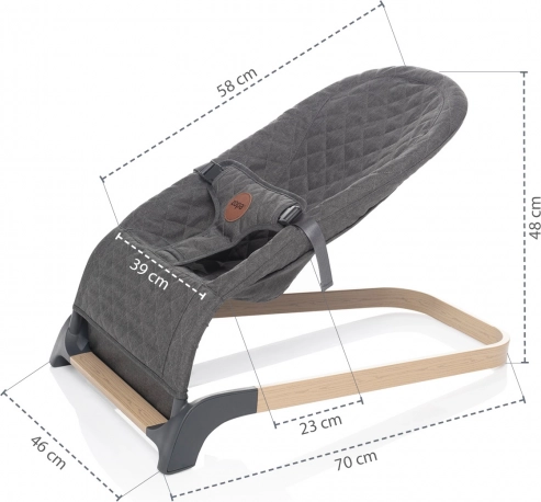 Leagănul este ușor și simplu de transportat. Datorită designului modern, cu decor de lemn, se integrează ușor în orice interior. Instalarea este foarte simplă. Leagănul respectă standardul de siguranță EN 12790.