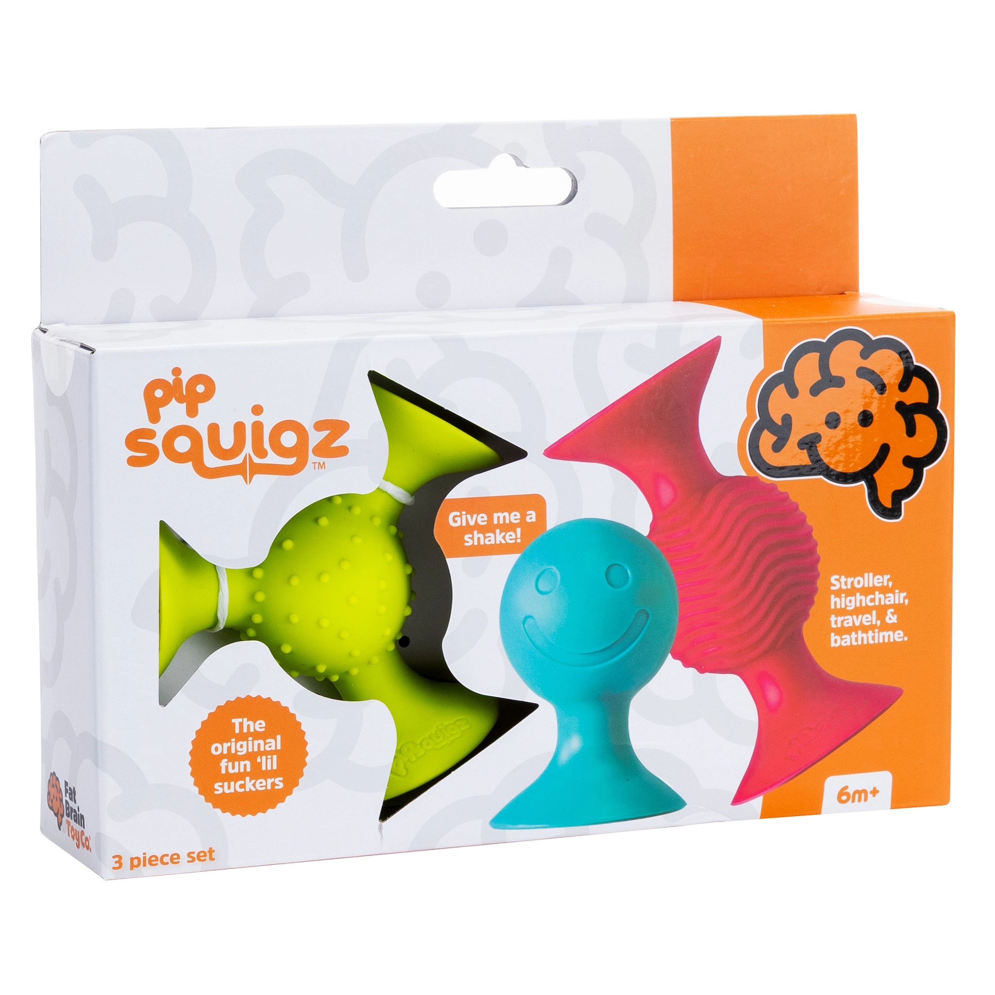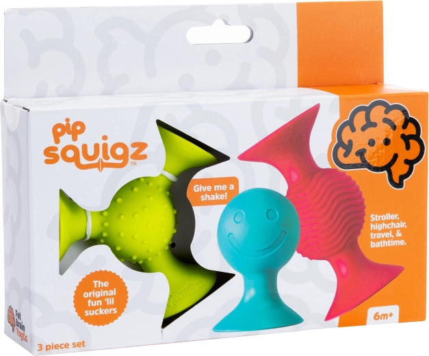 Setul pipSquigz (3 buc) oferă copiilor posibilități nesfârșite de joacă acasă și în călătorii. Fiecare piesă este realizată din silicon moale, de calitate, și este echipată cu ventuze care aderă sigur pe suprafețe netede – pe scaunul de masă, în cadă sau pe fereastră. Elemente zornăitoare și texturate invită la prindere și frământare, dezvoltând natural motricitatea și simțurile.