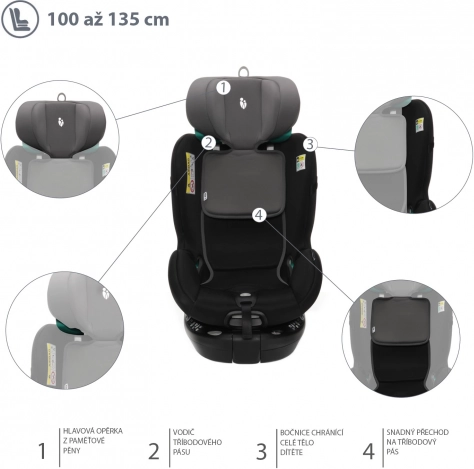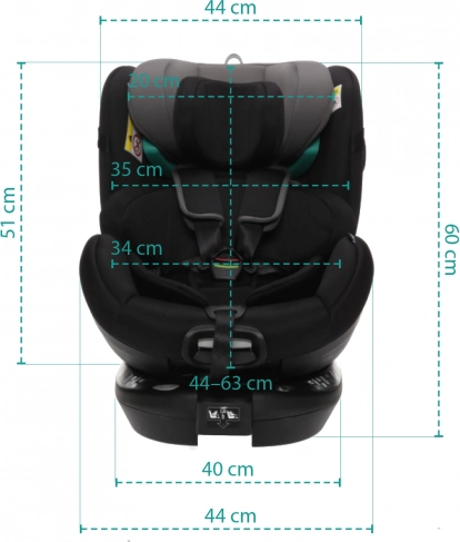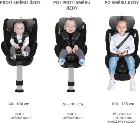 De la naștere până la 19,5 kg, copiii sunt protejați de centura de siguranță în 5 puncte cu cataramă de calitate Immi. În această etapă, scaunul auto se fixează cu isofix și picior de sprijin. Copiii pot călători cu spatele la sensul de mers până la 105 cm. Datorită rotirii, de la 76 cm se poate alege și călătoria în sensul de mers. Când copilul crește, treceți simplu la prinderea cu centura în 3 puncte a vehiculului. Piciorul de sprijin se pliază sub scaunul auto. Copilul dumneavoastră este perfect protejat de la naștere până la 135 cm.