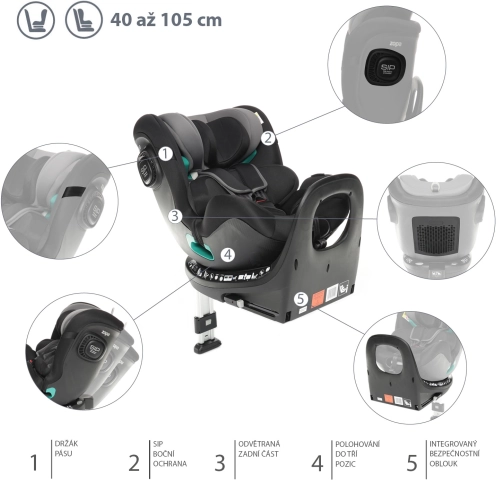 De la naștere și până la 19,5 kg, copiii sunt protejați de centura de siguranță în 5 puncte cu cataramă de calitate Immi. În această etapă, scaunul auto se fixează cu isofix și picior de sprijin. Copiii pot călători cu spatele la sensul de mers până la 105 cm. Datorită rotirii, de la 76 cm se poate alege și călătoria în sensul de mers. Când copilul crește, treceți simplu la fixarea cu centura în 3 puncte a vehiculului. Piciorul de sprijin se pliază sub scaunul auto. Copilul dvs. este perfect protejat de la naștere până la 135 cm.