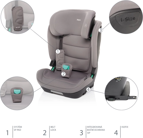 Pentru impact frontal, scaunul este echipat cu SP PAD, care reduc solicitarea asupra capului, coloanei cervicale și toracelui. Funcția Belt Lock adaugă un al 4-lea punct la fixare și reduce presiunea asupra abdomenului copilului în cazul unui impact frontal. Protecția laterală integrată SIP pe toată lungimea protejează copilul inclusiv în zona inferioară. Conformarea cu cel mai nou standard i-SIZE garantează siguranță pe toată durata utilizării.