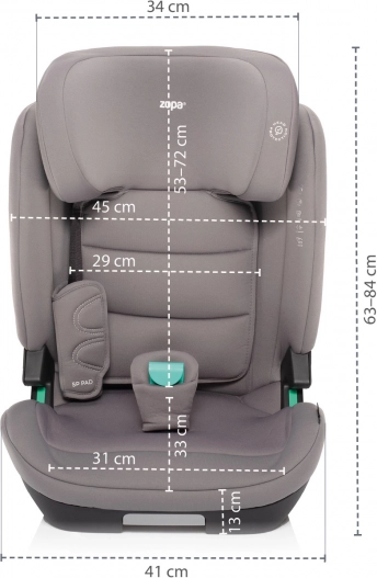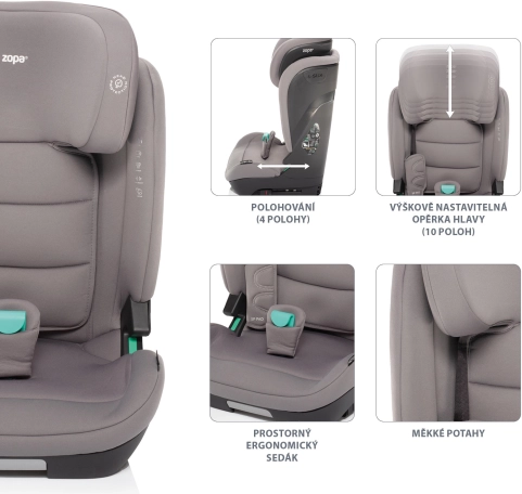 Scaun auto spațios, cu huse moi și posibilitatea de înclinare în 4 poziții ergonomice, asigură o călătorie confortabilă chiar și pe distanțe mai lungi și în timpul somnului. Reglarea poziției se setează ușor cu o clapetă în partea din față a scaunului auto. Tetiera oferă până la 10 poziții de reglaj, astfel scaunul auto crește odată cu copilul.