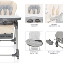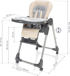 Scăunelul Monti 2 se adaptează oricărei mese datorită celor 6 poziții de reglare a înălțimii. Cu 3 poziții ale spătarului, 3 poziții ale suportului pentru picioare și 3 poziții ale distanței copilului față de tăviță, Monti 2 devine un însoțitor excelent atât pentru luarea mesei, cât și pentru odihnă. Spătarul se poate regla aproape în poziție orizontală, transformând Monti 2, multifuncțional, într-un șezlong potrivit încă de la nașterea bebelușului. În plus, respectă normele de siguranță EN 14988 și EN 12790, ceea ce îl face un însoțitor absolut sigur pentru mese fără griji.