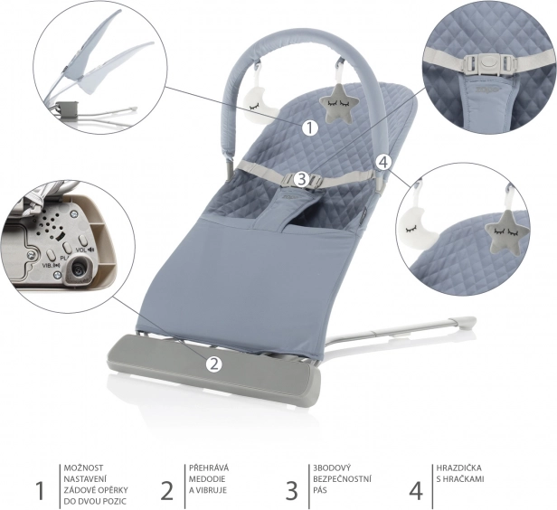 Vibrațiile plăcute, cele 2 poziții ale spătarului, tapițeria confortabilă, în plus cu un design modern care se potrivește oricărei locuințe, îi vor oferi micuțului dumneavoastră o odihnă perfectă. Timpul petrecut în șezlong poate fi nu doar relaxare, ci și distracție datorită barei pentru jucării, care stimulează simțurile bebelușului.