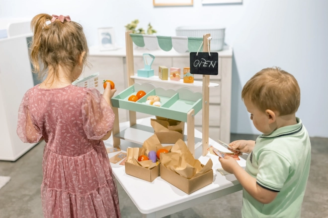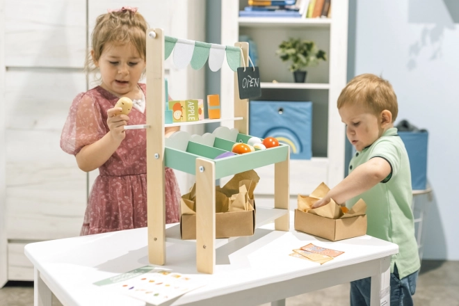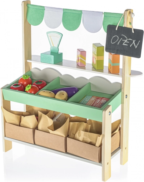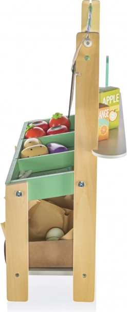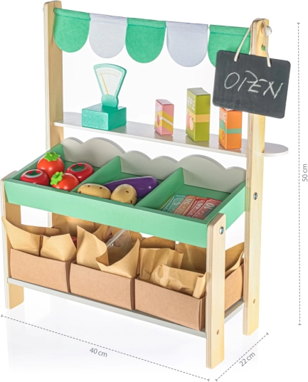 Stand de piață plin de distracție – conceput pentru a inspira creativitatea și jocurile de rol ale copiilor. Materialele din lemn sigure și de calitate asigură o durată lungă de viață. Copiii se vor bucura de ore întregi de distracție organizându-și propria piață, atât acasă cât și afară pe terasă.
