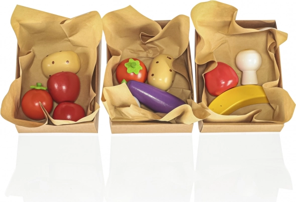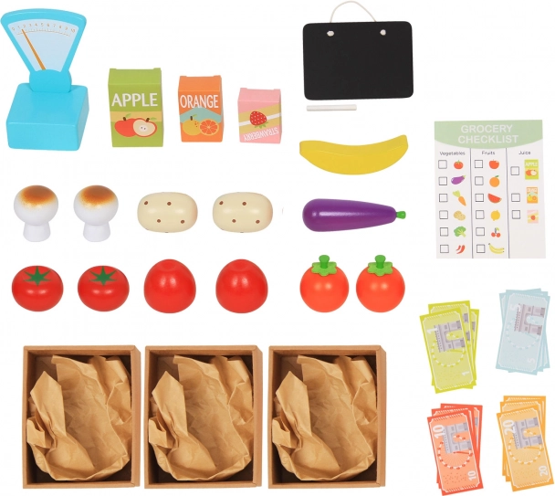 Echipament comercial complet – toate accesoriile necesare sunt incluse în pachet. Veți găsi aici lădițe din lemn, cântar, listă de cumpărături și bani. Copiii pot intra în rolul de comercianți și clienți, învățând cum funcționează piața.