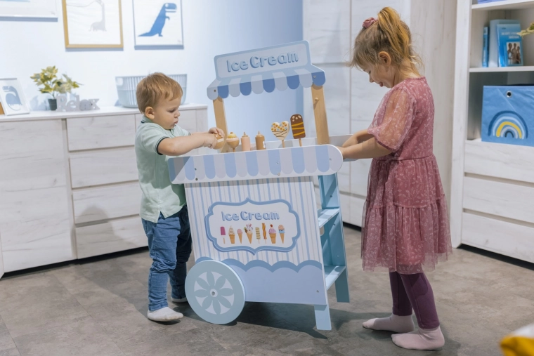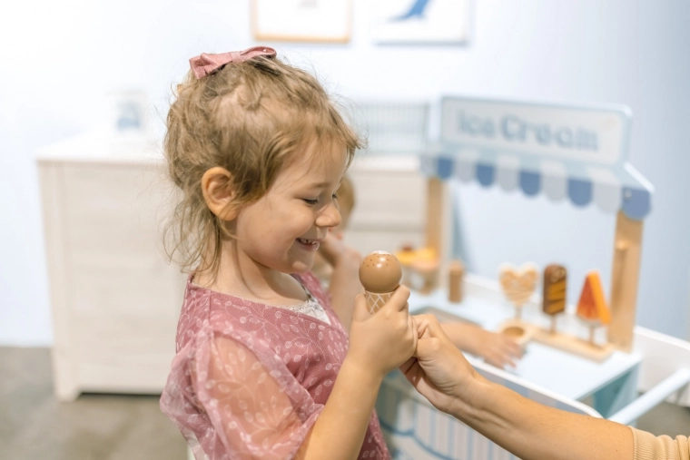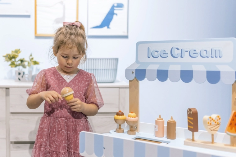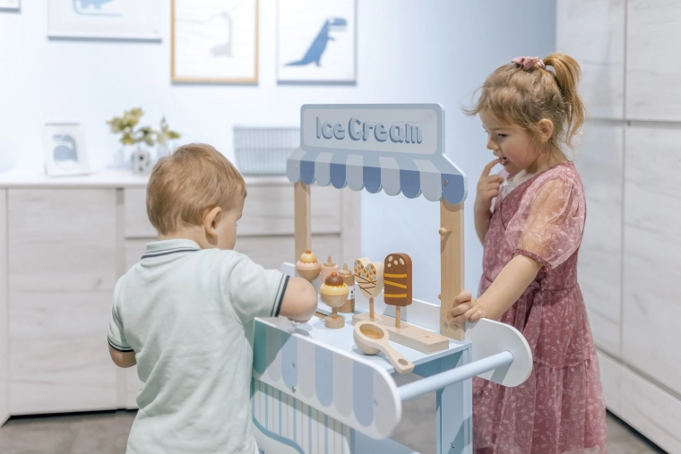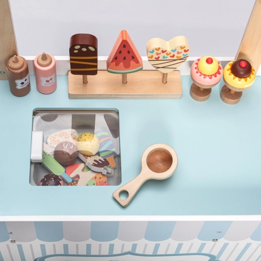 Copiii pot imita autentic munca unui vânzător de înghețată cu recuzite realiste.