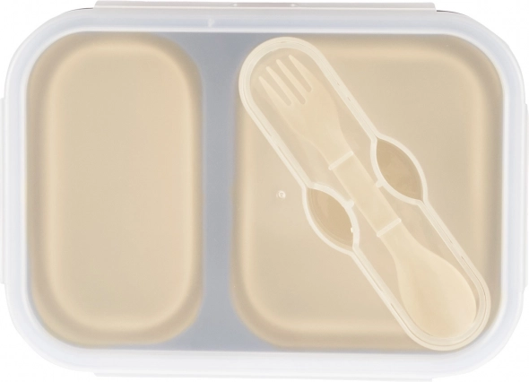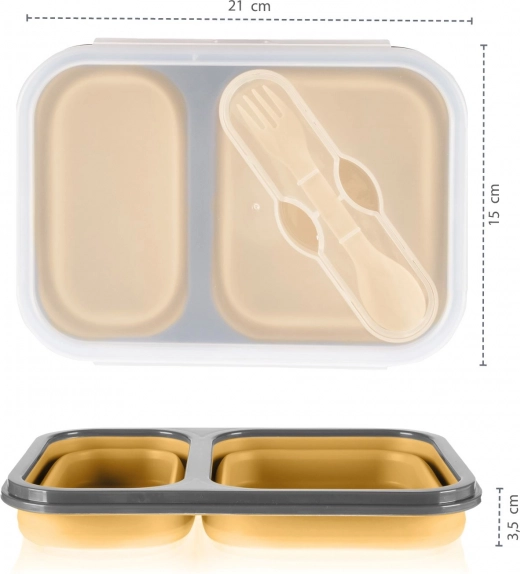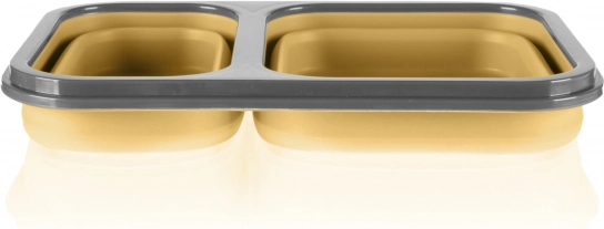 Această cutie pentru gustări este realizată din silicon alimentar sigur, netoxic și rezistent la spargere. Un mare avantaj este că poate fi pliată ușor după ce ați mâncat conținutul – astfel își reduce volumul cu până la 60%, devenind un însoțitor ideal și compact pentru excursii. Capacul etanșează foarte bine și include un compartiment pentru tacâmuri; lingura și furculița sunt incluse într-o husă practică.