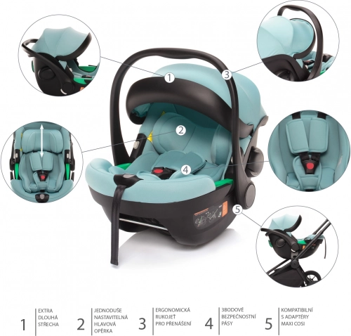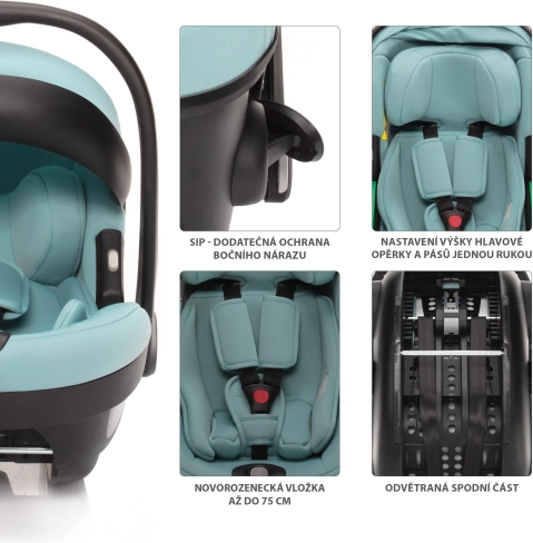 Copertina extra lungă este independentă de mâner, astfel puteți folosi mânerul pentru a transporta scaunul auto chiar și fără copertina trasă, sau invers. Copertina protejează copilul împotriva soarelui puternic, vântului și a unei ploi ușoare. Mânerul ergonomic a fost proiectat pentru a facilita la maximum transportul. Centura de siguranță în 3 puncte vă ușurează fixarea copilului în scaunul auto, iar tetiera ușor reglabilă contribuie la setarea comodă a poziției pentru micuțul dumneavoastră, adaptându-se pe măsură ce copilul crește. În plus, odată cu reglarea tetierei ajustați simultan și înălțimea centurilor. Pentru confort maxim, tetiera este umplută cu spumă cu memorie. În partea din spate a scaunului auto există o aerisire practică. Pentru confortul nou-născuților, scaunul auto XM vine cu o inserție de nou-născut de calitate, utilizabilă până la înălțimea copilului de 75 cm.