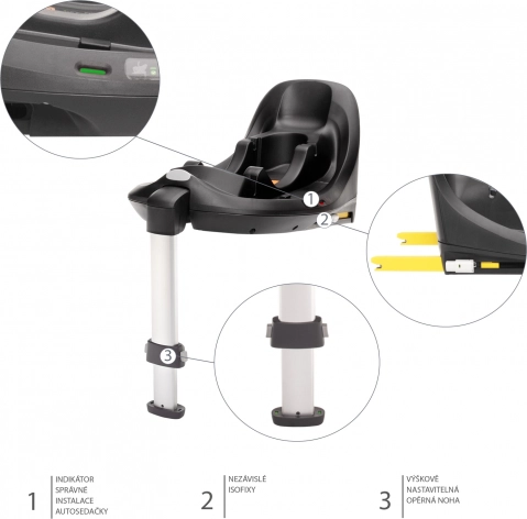 ISOFIX independent cu indicatori pentru o instalare ușoară și sigură a scaunului auto în vehicul. Scaunul auto are picior de sprijin, care adaugă un punct suplimentar pentru o stabilitate mai mare; și piciorul de sprijin are propriul indicator de setare corectă. O stabilitate mai bună este asigurată și de bara de siguranță. Instalarea corectă a scaunului auto pe bază este confirmată de indicatorii de instalare corectă. Demontarea scaunului auto de pe bază se face simplu, prin siguranță.