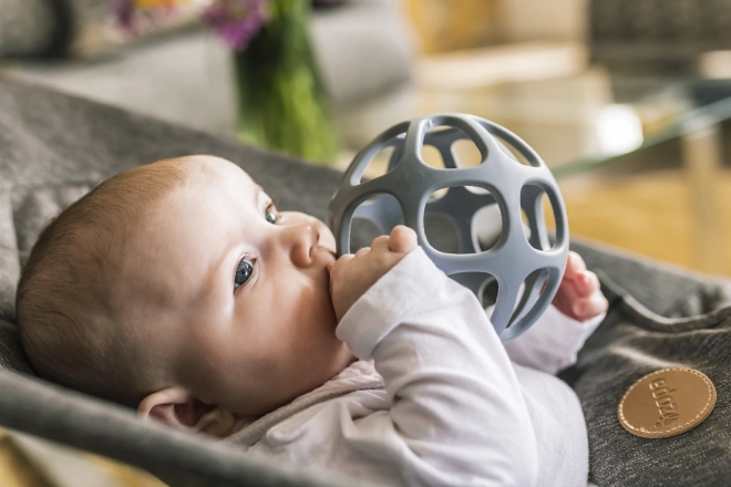 Jucăria de dentiție este realizată din silicon alimentar sigur, netoxic și rezistent la spargere. Pentru copiii mici, siliconul este mai natural decât plasticul sau metalul. Designul sub forma unei mingi deschise se potrivește perfect chiar și în cel mai mic pumn și copilul o poate prinde ușor din orice unghi. Datorită formei sale, jucăria de dentiție stimulează motricitatea mâinilor, în special coordonarea mână-ochi.