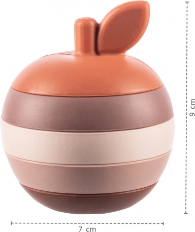 Jucăria pliabilă în formă de măr este un joc distractiv care va ține copilul ocupat mult timp; pe lângă distracție, dezvoltă motricitatea fină și coordonarea mână-ochi. Conține 5 piese care se așază una peste alta formând un măr. Distracție grozavă la picnic în aer liber, în cadă sau acasă pe covorașul de joacă; ajută copilul să învețe formele, culorile, percepția spațiului, număratul, precum și abilități logice și motorii. De asemenea, servește ca inel de dentiție, stimulând gingiile solicitate în timpul erupției primilor dinți.
