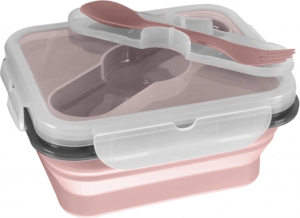 Această cutie pentru gustare este realizată din silicon alimentar sigur, netoxic și rezistent la spargere. Un mare avantaj este plierea ușoară, datorită căreia își reduce dimensiunea cu până la 60%, devenind astfel un însoțitor ideal pentru excursii. Capacul etanșează foarte bine și are un compartiment integrat pentru tacâmuri, iar lingurița cu furculiță sunt incluse într-o husă practică.