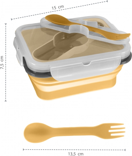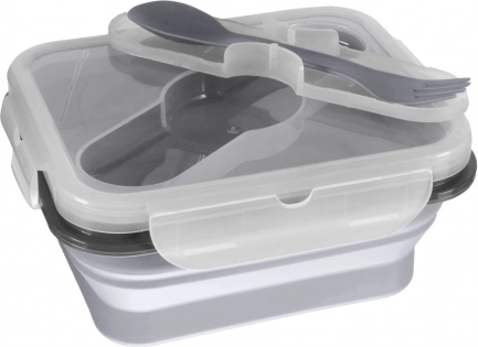 Această cutie pentru gustări este realizată din silicon alimentar sigur, netoxic și rezistent la spargere. Un mare avantaj este plierea ușoară, datorită căreia își reduce dimensiunea cu până la 60%, devenind partenerul ideal pentru excursii. Capacul etanșează foarte bine, are un compartiment integrat pentru tacâmuri, iar lingurița cu furculiță sunt incluse într-o husă practică.