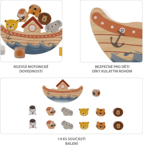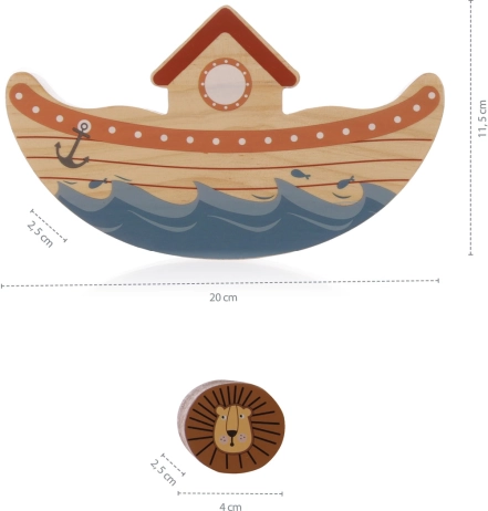 Joacă singur sau cu mai mulți jucători – copii, adulți, bunici – acest joc distractiv îi va încânta pe toți! Încarcă treptat toate animăluțele de lemn pe punte, dar atenție! Cu cât sunt mai multe animăluțe pe punte, cu atât crește riscul ca arca să se răstoarne sau ca animăluțele să cadă de pe navă!