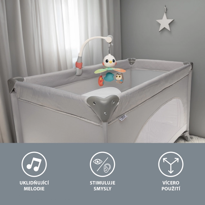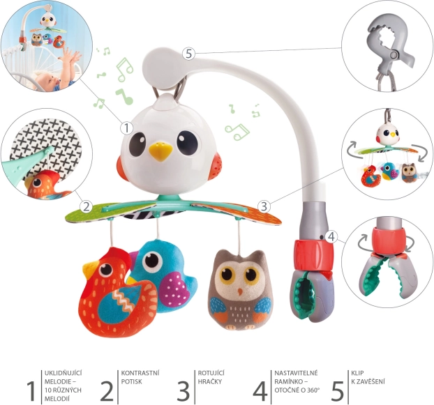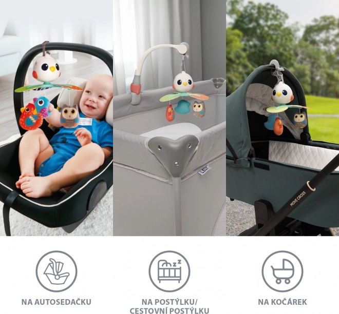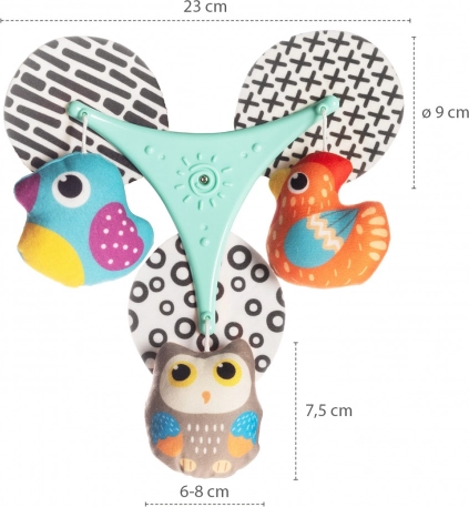 Jucăria care se rotește oferă nu doar stimulare vizuală, ci și posibilitatea de a fi folosită ca jucărie rotativă de sine stătătoare. Cu trei moduri de prindere pe scaunul auto, pătuț sau cărucior, copilul dumneavoastră va fi mereu înconjurat de distracție.