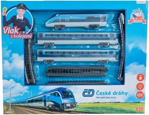 Sunt incluse o locomotivă, două vagoane, 12 șine curbe și 8 șine drepte, cu o lungime totală de 4,8 m. Elementele liniei ferate se fixează ușor prin clipsare și pot fi combinate după preferință. Setul este compatibil cu popularul tren REGIOJET și poate fi extins cu șine și schimbătoare suplimentare (se vând separat).