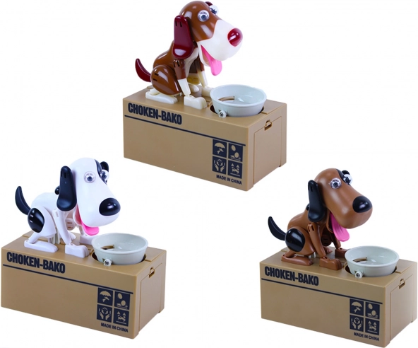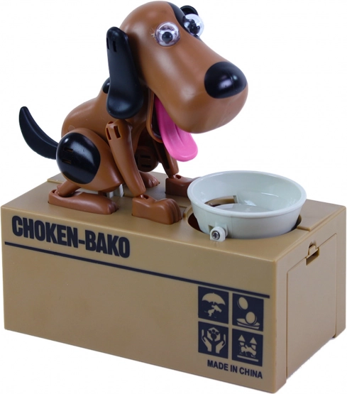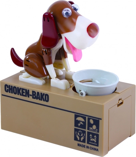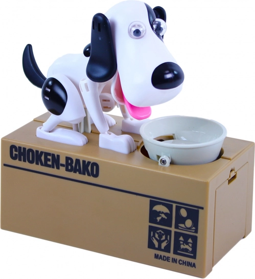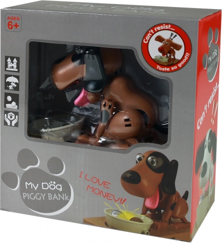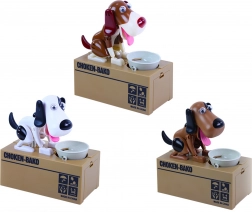 Pușculița oferă o formă amuzantă de economisire. Puneți moneda pe farfurie și urmăriți cum câinele o mănâncă și o depozitează în interiorul pușculiței.