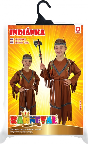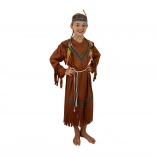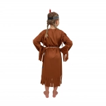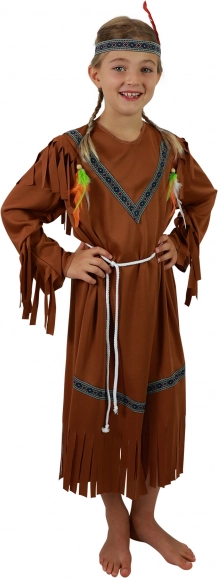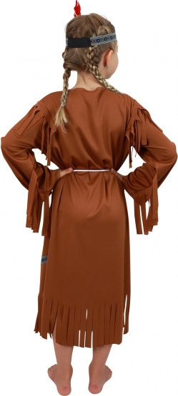 Transformați micuța domnișoară într-o indiancă curajoasă. Acest costum maro, cu motive decorative, ciucuri ornamentali și bentiță colorată cu pană, se potrivește frumos și atrage privirile la orice carnaval, petrecere tematică sau joc acasă.