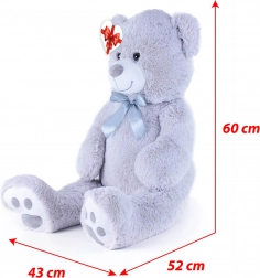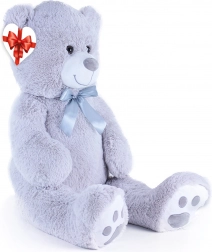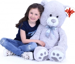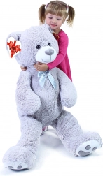 Urs mare de pluș gri, cu lungimea de aprox. 100 cm, încântă prin moliciunea, drăgălășenia și execuția sa de calitate. Suprafața catifelată îmbie la îmbrățișat, fundița satinată adaugă un aspect elegant, iar eticheta în formă de inimă îți permite să adaugi un mesaj personal – ideal pentru aniversări, sărbători sau ca decor în camera copilului.