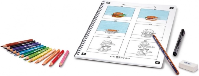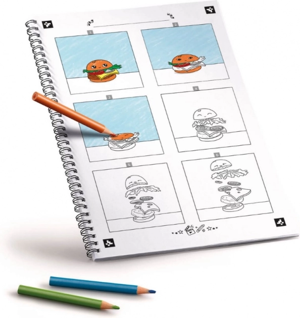Copiii pot colora șabloanele sau își pot inventa propriile povești, scriindu-le în cadrele goale pregătite. Desenele pot fi transformate cu ușurință în povești animate reale. Este suficient să fotografiezi cele 12 grafici color amplasate pe două pagini alăturate ale caietului în aplicația gratuită creată special și e gata.