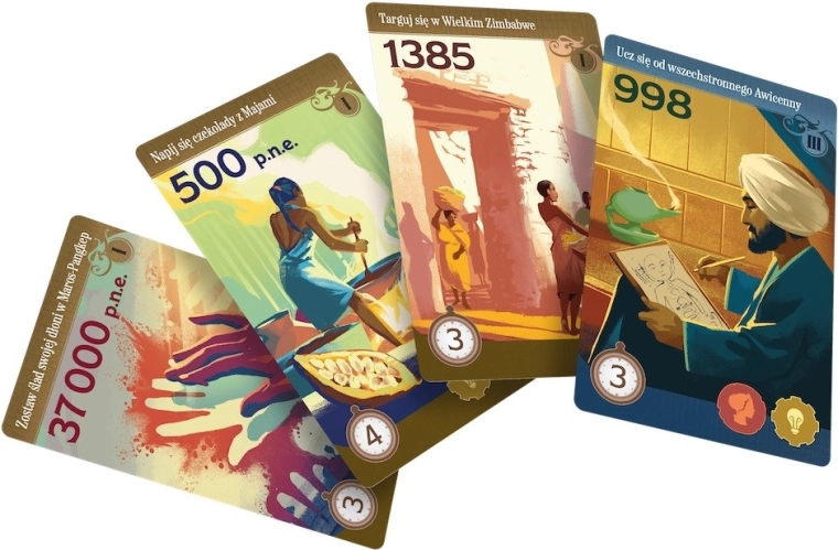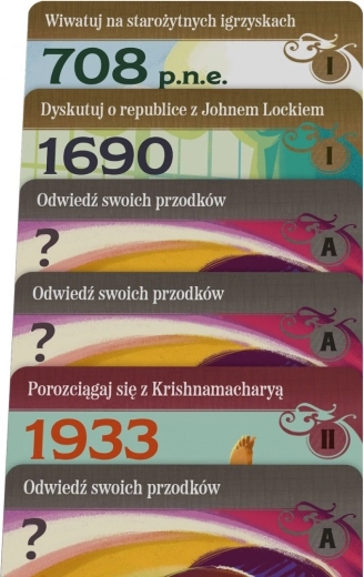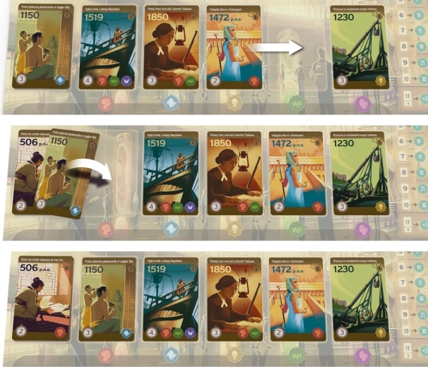 Pe tabla de joc vă așteaptă cărți de evenimente către care vă puteți deplasa. Moneda în joc este timpul, marcat pe un ceas special, iar costul unei cărți depinde de poziționarea ei. Dacă țineți neapărat la una dintre ele, vă puteți deplasa mai departe pe tabla cu ceasul, dar trebuie avut în vedere că ceasul are rolul important de a stabili ordinea în care vă veți juca turele. În acest joc nu acționăm pe rând în mod fix; este activ jucătorul care se află cel mai în urmă pe ceas. O mutare aparent extrem de avantajoasă se poate dovedi mai puțin atractivă când ne dăm seama că astfel le vom permite adversarilor să joace de două ori înainte să ne ajungă din urmă.