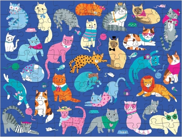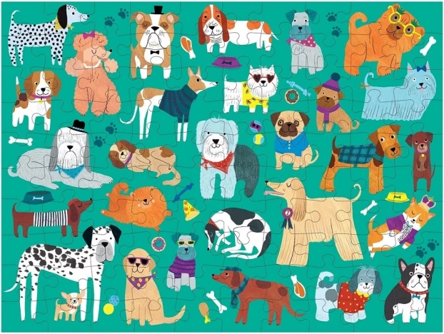 Acest puzzle reversibil oferă distracție dublă: pe o parte veți găsi ilustrații adorabile cu câini, iar pe cealaltă parte pisici frumoase. Cu 100 de piese, este ideal pentru copiii de la 6 ani și pentru asamblare în familie. Calitatea execuției și culorile vii susțin concentrarea și antrenează memoria vizuală.