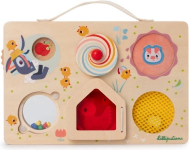 Panoul din lemn în formă de valiză, cu îndrăgitele motive de la fermă, ușor de luat oriunde, aduce un mod distractiv pentru copii de a descoperi lumea. Acest panou le permite copiilor încă de la un an să se implice în activități variate, care nu doar îi distrează, ci și îi educă.