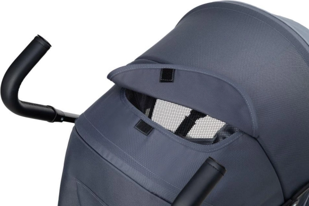 Fereastra din copertină vă permite să supravegheați copilul. În pachet primiți în plus geantă pentru părinți, husă de ploaie și plasă împotriva insectelor.