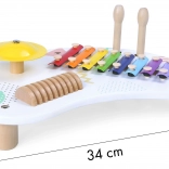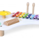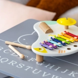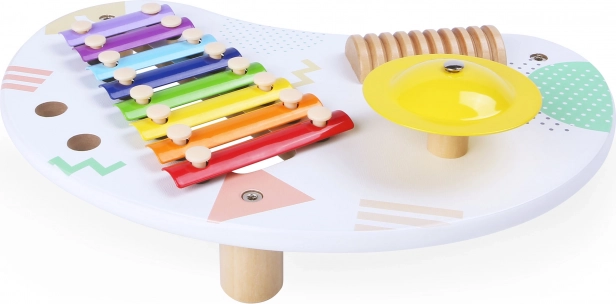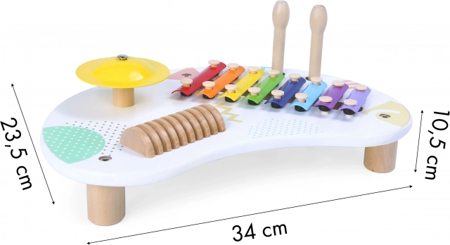 Măsuța muzicală pentru copii ECOTOYS este alegerea ideală pentru micii muzicieni. Oferă un xilofon cu 8 tonuri, un cinel cu sunet clar și un scraper din lemn pentru acompaniamente ritmice. Datorită celor două bețișoare din lemn, copiii pot explora cu ușurință diverse culori sonore și își exersează coordonarea mână–ochi.