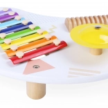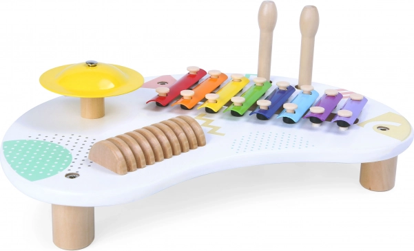 Măsuța este fabricată din lemn și metal de calitate și are margini rotunjite sigure. Designul colorat atrăgător stimulează percepția vizuală și motivează joaca independentă. Excelent ca prim set muzical, care susține percepția auditivă, ritmica și creativitatea.