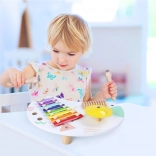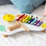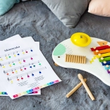 Xilofon colorat cu 8 tonuri, cinel clar și scraper (guiro) din lemn oferă o paletă variată de sunete pentru primele activități muzicale și jocuri ritmice.