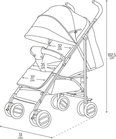 Căruciorul este echipat cu roți manevrabile din spumă EVA, rezistente la perforare, cu blocarea roților din față și elemente reflectorizante pentru vizibilitate sporită. Spătarul și suportul pentru picioare reglabile asigură confort de la 6 luni până la 15 kg. Posibilitatea practică de a detașa bara frontală pe o parte ușurează așezarea copilului.