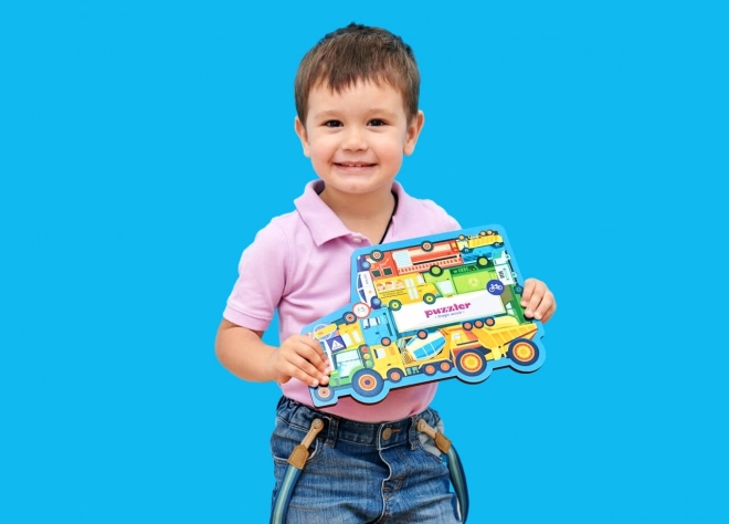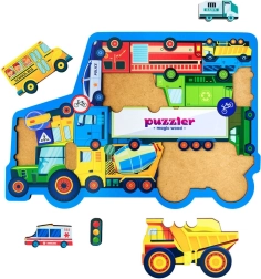 Dimensiunea puzzle-ului asamblat este de aprox. 29 × 20,5 cm – perfect pentru mâinile copiilor și pentru masa de joacă de acasă. Puzzle-ul este o alegere excelentă pentru copiii interesați de tot felul de mașini și, în același timp, susține coordonarea mână–ochi și dezvoltarea cognitivă.