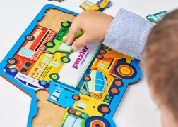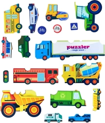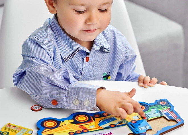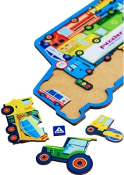 Puzzle-ul din lemn cu tema transportului aduce copiilor învățare prin joacă. Fiecare dintre cele 18 piese reprezintă un vehicul sau un indicator rutier, datorită cărora copiii își exersează recunoașterea formelor, vocabularul și răbdarea. Construcția solidă din lemn garantează durabilitate și o manipulare sigură pentru mânuțele mici.