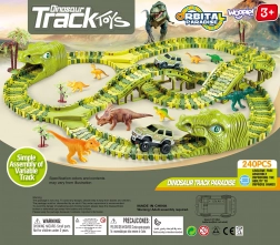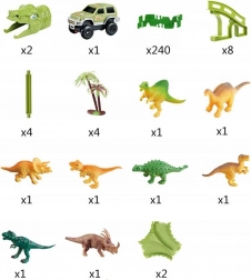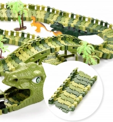 Construiește pentru copii o lume a aventurilor preistorice. Setul conține totul pentru joacă îndelungată și creativă: o pistă verde modulară, 8 dinozauri (inclusiv 2 mari), 2 tuneluri în formă de cap de dinozaur, poduri, copăcei și o mașinuță electrică pe baterie AA. Piesele se clipsază ușor pentru a crea un circuit în care mașinuța merge singură.