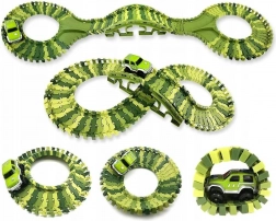 Dimensiunile maxime ale pistei asamblate sunt aprox. 80 × 85 × 8 cm, astfel încât încape fără probleme în camera copilului. Setul dezvoltă creativitatea, imaginația spațială și îndemânarea – și oferă o rulare dinamică datorită suprafeței flexibile a pistei, cu aderență bună pentru vehicul.