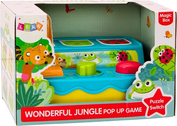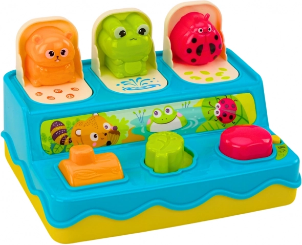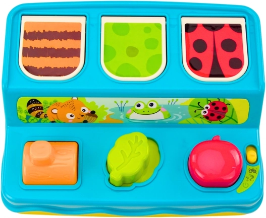 Jucăria este alcătuită dintr-o bază colorată solidă, pe care sunt plasate diferite forme și butoane. Fiecare formă reprezintă un alt animal, iar butoanele servesc la activarea lor. Când copilul apasă sau mișcă o anumită formă, unul dintre cele trei animăluțe sare în sus, încurajându-l pe micuț să continue explorarea.
