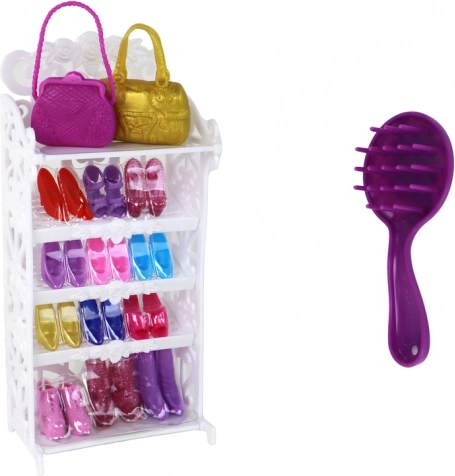 Setul include o garderobă albă cu 12 perechi de pantofi cu toc, două genți, bijuterii, un pieptene și o agrafă de păr – tot ce trebuie pentru joacă creativă și dezvoltarea imaginației. Jucăria are certificare CE, respectă standardul EN 71 și este potrivită pentru copii de la 3 ani.
