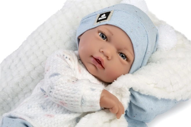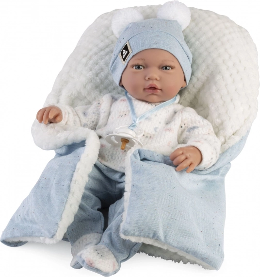 Păpușă realistică bebeluș cu corp moale textil, care poate fi ușor poziționat. Mâinile și picioarele sunt atașate cu articulații, ceea ce permite păpușii să stea. Vine cu suzetă ca accesoriu.