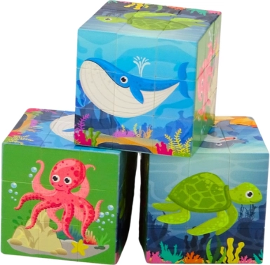 .Sarcina copilului este să aranjeze cubul astfel încât, după potrivirea fețelor, să rezulte o singură imagine unitară cu animale marine.